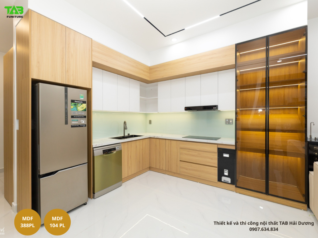 Không gian bếp được bố trí theo dạng chữ L, khai thác tối đa diện tích nhưng vẫn đảm bảo sự thoáng đãng.