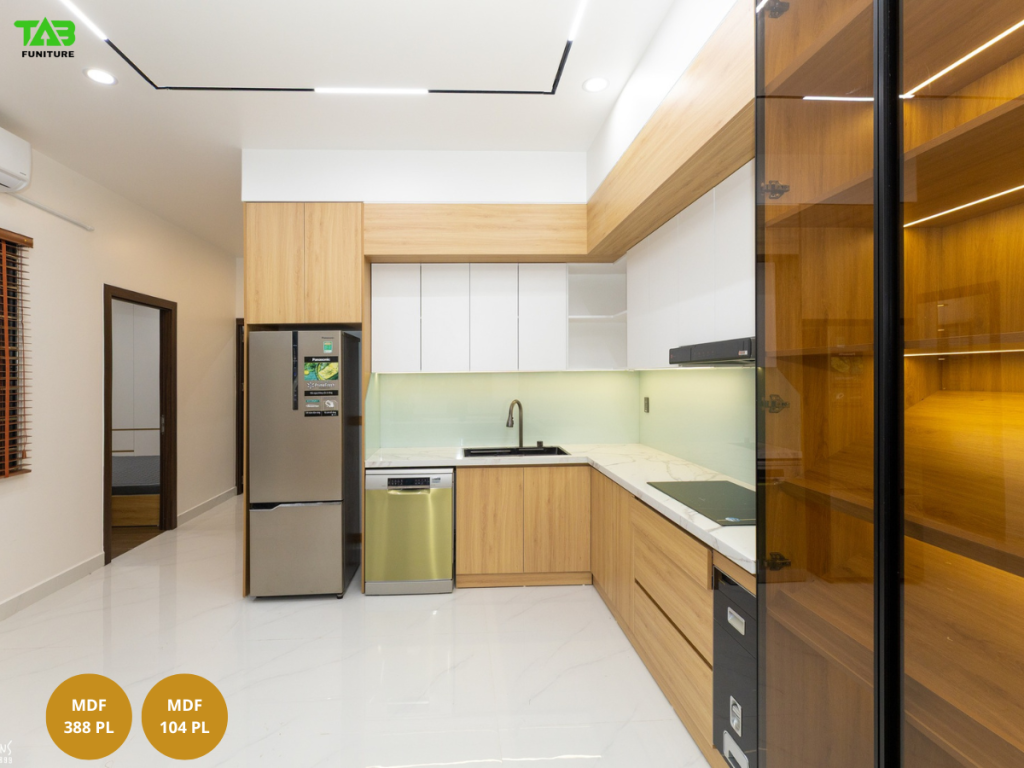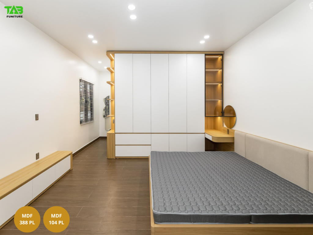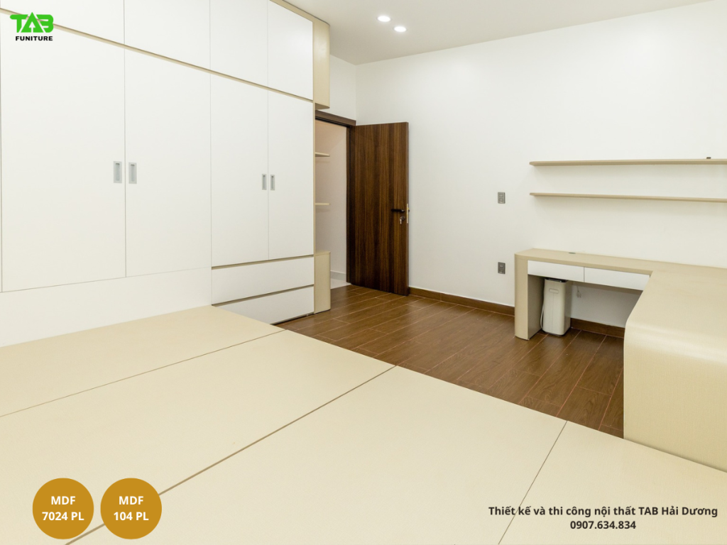 Căn nhà được TAB hoàn thiện với phong cách hiện đại – tinh gọn – tiện nghi, sử dụng chủ đạo chất liệu MDF Vanachai Thái Lan phủ Melamine. Đây là dòng vật liệu nổi bật với khả năng chống ẩm, chống cong vênh, bề mặt mịn và tuổi thọ cao, rất phù hợp cho những công trình cần độ bền ổn định lâu dài.