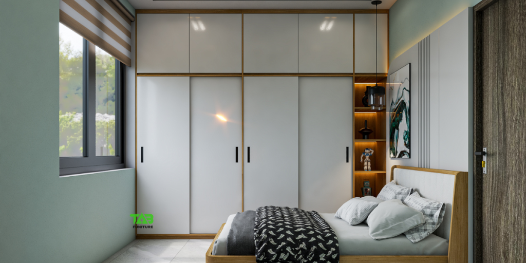 Hệ tủ quần áo cao kịch trần giúp tối ưu diện tích và tăng không gian lưu trữ.